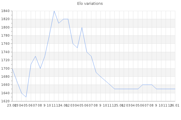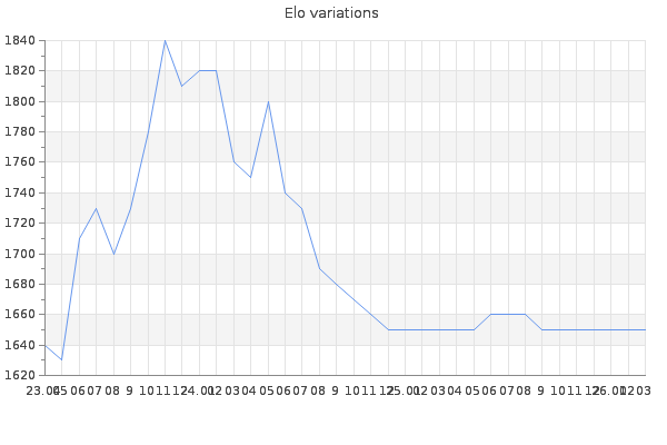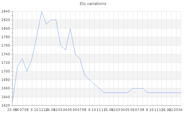 Elo no rounded:1650.8 Rd ( Small rd indicates a reliable elo ) : 83 Fast Elo :1489 Fast Rd : 275 Elo max :2160 Elo max this year :2160 Moves played :35694 Country:Spain