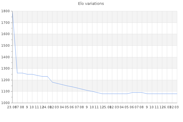 Elo no rounded:1082.9 Rd ( Small rd indicates a reliable elo ) : 123 Elo max :1410 Elo max this year :1410 Moves played :95 Country:Mexico
