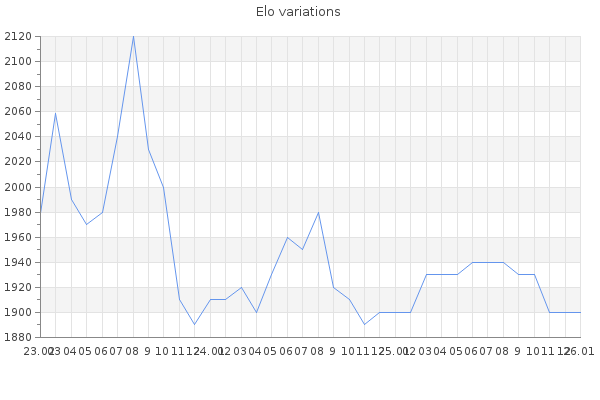 Elo no rounded:1904.5 Rd ( Small rd indicates a reliable elo ) : 119 Elo max :2280 Elo max this year :2280 Moves played :5655 Country:Germany