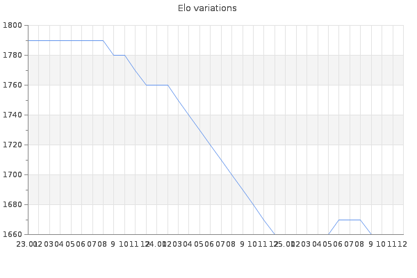 Elo no rounded:1659.7 Rd ( Small rd indicates a reliable elo ) : 80 Elo max :2210 Elo max this year :2210 Moves played :14416 Country:Canada