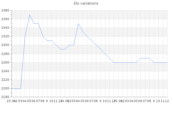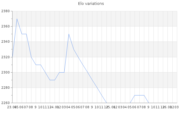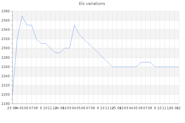 Elo no rounded:2255.2 Rd ( Small rd indicates a reliable elo ) : 110 Elo max :2410 Elo max this year :2410 Moves played :1207 Country:France