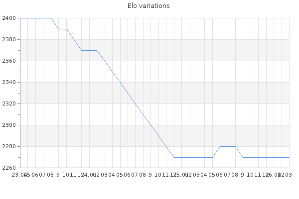 Elo no rounded:2271.9 Rd ( Small rd indicates a reliable elo ) : 98 Elo max :2630 Elo max this year :2630 Moves played :1584 Country:Switzerland