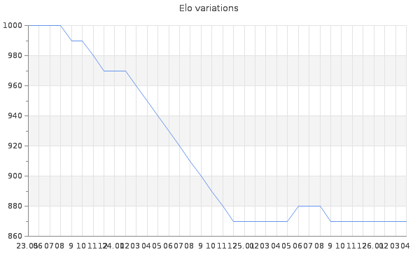 Elo no rounded:874.2 Rd ( Small rd indicates a reliable elo ) : 115 Fast Elo :1439 Fast Rd : 290 Elo max :1310 Elo max this year :1310 Moves played :369 Country:Italy