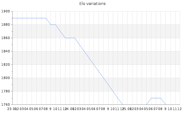 Elo no rounded:1760.7 Rd ( Small rd indicates a reliable elo ) : 109 Fast Elo :1449 Fast Rd : 270 Elo max :2070 Elo max this year :2070 Moves played :1831 Country:India