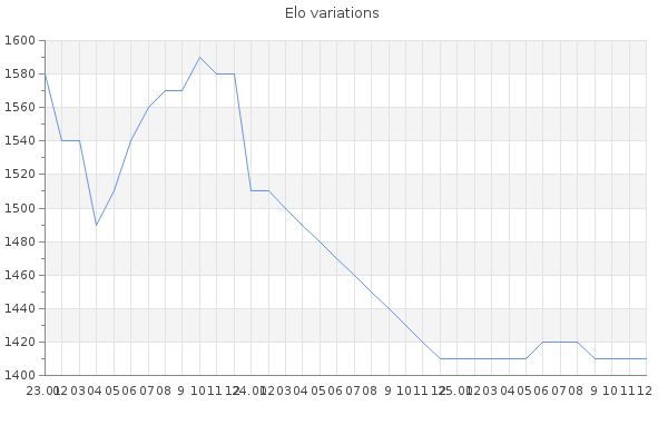 Elo no rounded:1408.2 Rd ( Small rd indicates a reliable elo ) : 115 Elo max :1590 Elo max this year :1590 Moves played :6125 Country:United Kingdom