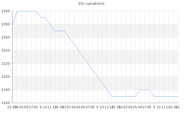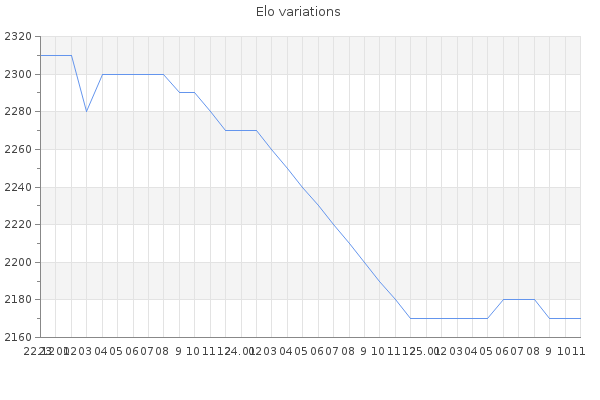 Elo no rounded:2174.1 Rd ( Small rd indicates a reliable elo ) : 101 Fast Elo :2039 Fast Rd : 160 Elo max :2490 Elo max this year :2490 Moves played :1965 Country:Portugal
