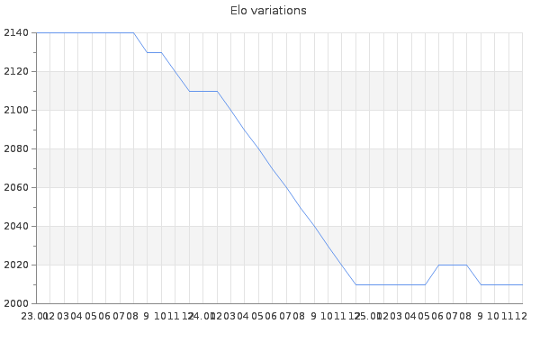 Elo no rounded:2011.3 Rd ( Small rd indicates a reliable elo ) : 80 Fast Elo :1689 Fast Rd : 187 Elo max :2360 Elo max this year :2360 Moves played :56955 Country:Slovenia
