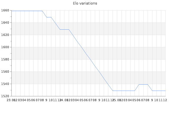 Elo no rounded:1526.5 Rd ( Small rd indicates a reliable elo ) : 261 Elo max :0 Elo max this year :0 Moves played :30 Country:United Kingdom