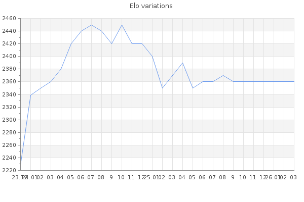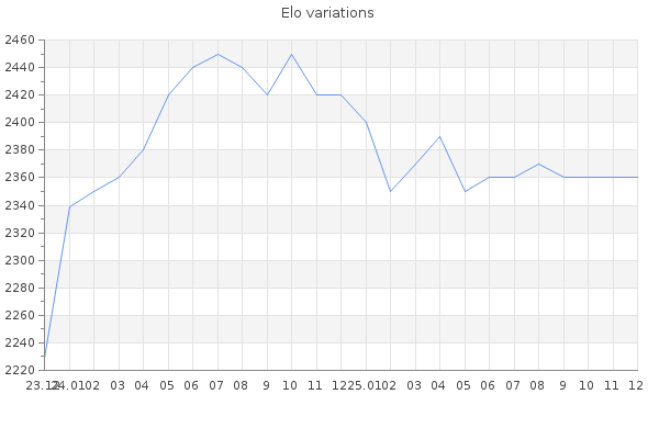 Elo no rounded:2361 Rd ( Small rd indicates a reliable elo ) : 98 Elo max :2460 Elo max this year :2460 Moves played :2562 Country:France
