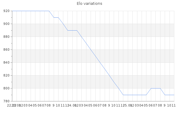 Elo no rounded:788.9 Rd ( Small rd indicates a reliable elo ) : 84 Fast Elo :1239 Fast Rd : 179 Elo max :1270 Elo max this year :1270 Moves played :1271 Country:Brazil