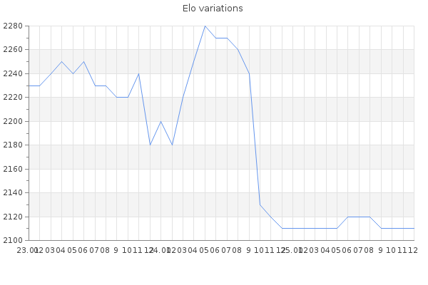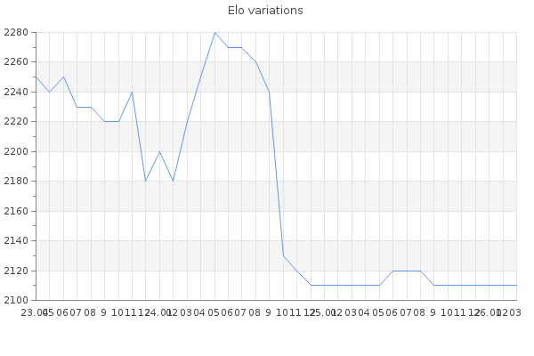 Elo no rounded:2105.8 Rd ( Small rd indicates a reliable elo ) : 91 Elo max :2310 Elo max this year :2310 Moves played :1714 Country:other Country