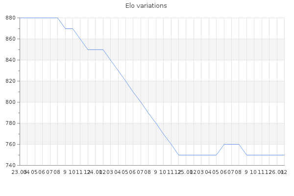 Elo no rounded:750.9 Rd ( Small rd indicates a reliable elo ) : 128 Fast Elo :1189 Fast Rd : 236 Elo max :1120 Elo max this year :1120 Moves played :79 Country:United States of America