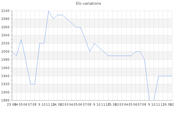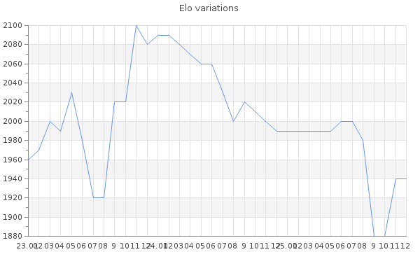 Elo no rounded:1935.2 Rd ( Small rd indicates a reliable elo ) : 84 Fast Elo :1810 Fast Rd : 106 Elo max :2390 Elo max this year :2390 Moves played :83018 Country:Italy