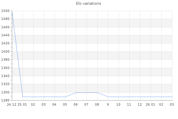 Elo no rounded:1292.6 Rd ( Small rd indicates a reliable elo ) : 208 Elo max :0 Elo max this year :0 Moves played :27 Country:Mexico