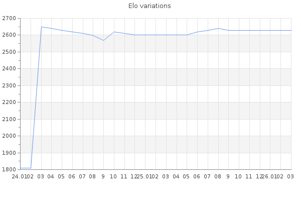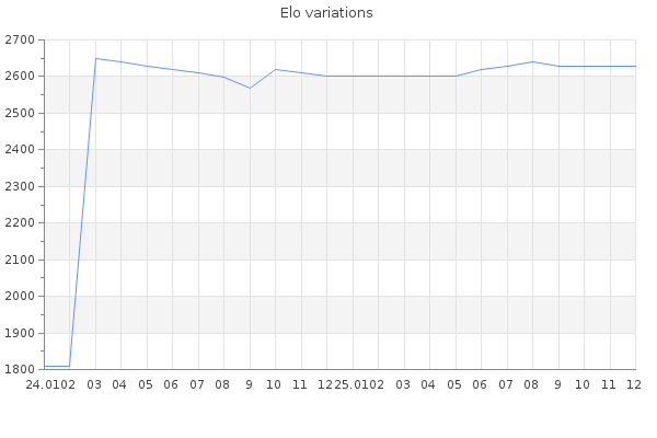 Elo no rounded:2626.1 Rd ( Small rd indicates a reliable elo ) : 156 Elo max :2620 Elo max this year :2620 Moves played :263 Country:Tonga