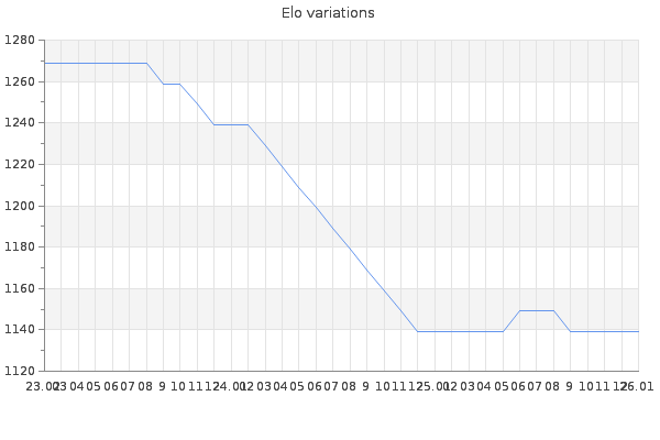 Elo no rounded:1141.4 Rd ( Small rd indicates a reliable elo ) : 222 Elo max :0 Elo max this year :0 Moves played :50 Country:Colombia