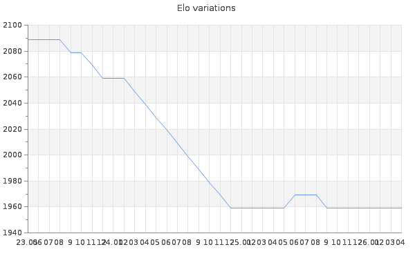 Elo no rounded:1956.7 Rd ( Small rd indicates a reliable elo ) : 157 Elo max :2250 Elo max this year :2250 Moves played :565 Country:Spain