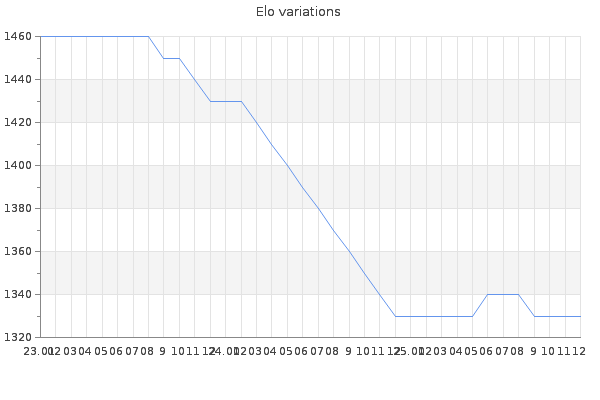 Elo no rounded:1325.9 Rd ( Small rd indicates a reliable elo ) : 80 Elo max :1870 Elo max this year :1870 Moves played :2099 Country:United States of America