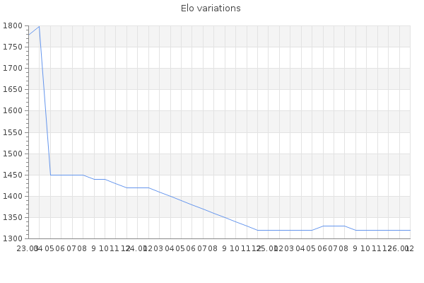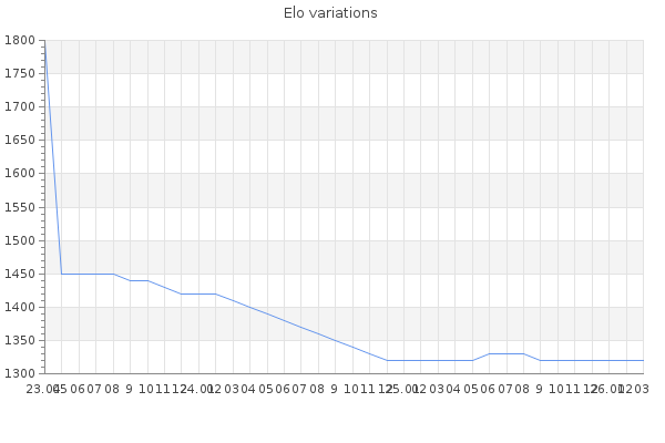 Elo no rounded:1319.4 Rd ( Small rd indicates a reliable elo ) : 109 Elo max :1780 Elo max this year :1780 Moves played :706 Country:French Polynesia