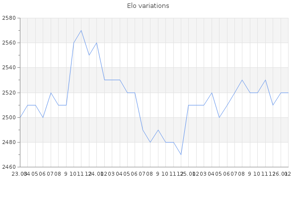 Elo no rounded:2517.9 Rd ( Small rd indicates a reliable elo ) : 114 Elo max :2750 Elo max this year :2750 Moves played :8061 Country:Romania