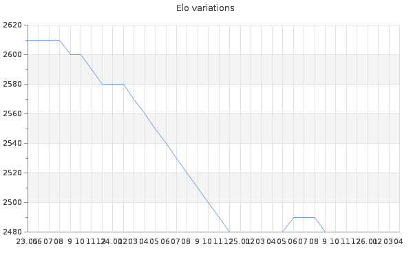 Elo no rounded:2475.1 Rd ( Small rd indicates a reliable elo ) : 88 Fast Elo :1819 Fast Rd : 259 Elo max :2790 Elo max this year :2790 Moves played :4419 Country:United Kingdom