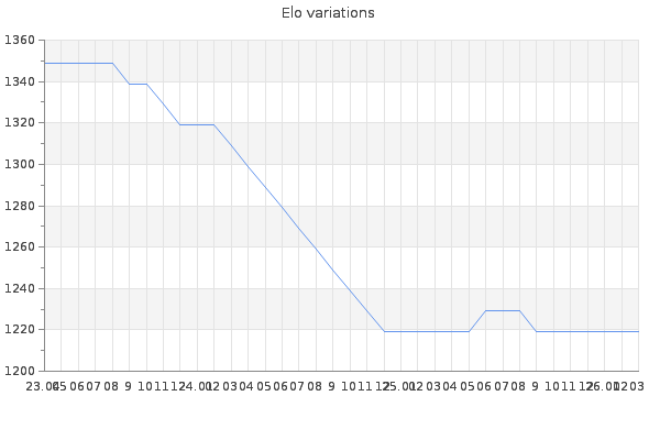 Elo no rounded:1220.6 Rd ( Small rd indicates a reliable elo ) : 177 Elo max :0 Elo max this year :0 Moves played :50 Country:France