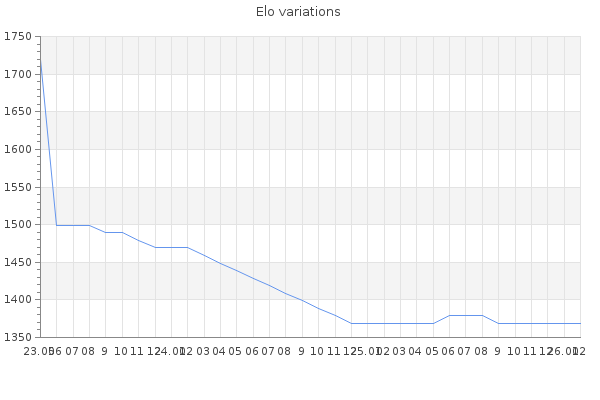 Elo no rounded:1365.2 Rd ( Small rd indicates a reliable elo ) : 167 Elo max :0 Elo max this year :0 Moves played :64 Country:Ukraine