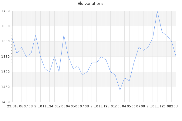 Elo no rounded:1549.5 Rd ( Small rd indicates a reliable elo ) : 80 Elo max :1700 Elo max this year :1700 Moves played :25800 Country:United States of America