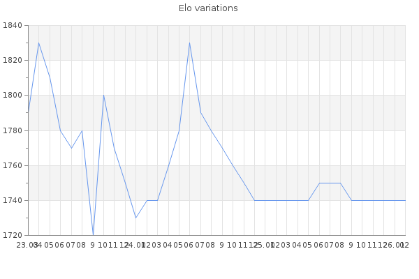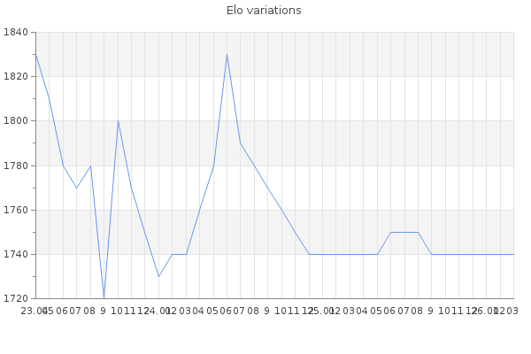 Elo no rounded:1744.5 Rd ( Small rd indicates a reliable elo ) : 84 Elo max :2020 Elo max this year :2020 Moves played :25686 Country:United States of America