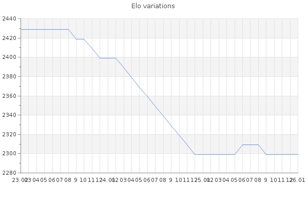 Elo no rounded:2300.5 Rd ( Small rd indicates a reliable elo ) : 185 Elo max :2050 Elo max this year :2050 Moves played :497 Country:Russia