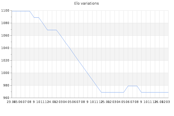 Elo no rounded:964.2 Rd ( Small rd indicates a reliable elo ) : 232 Fast Elo :1359 Fast Rd : 277 Elo max :0 Elo max this year :0 Moves played :0 Country:Colombia