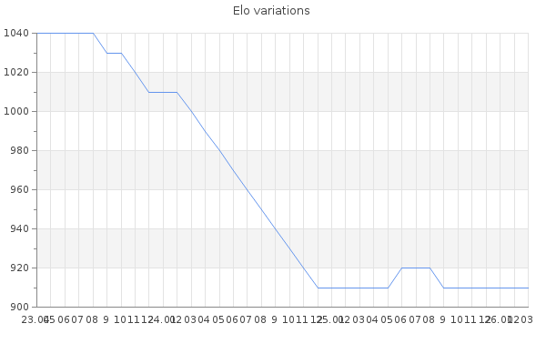 Elo no rounded:910.5 Rd ( Small rd indicates a reliable elo ) : 114 Fast Elo :1009 Fast Rd : 166 Elo max :1220 Elo max this year :1220 Moves played :518 Country:Italy