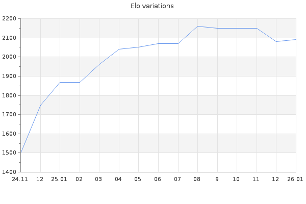 Elo no rounded:2087.5 Rd ( Small rd indicates a reliable elo ) : 121 Elo max :2160 Elo max this year :2160 Moves played :470 Country:Austria