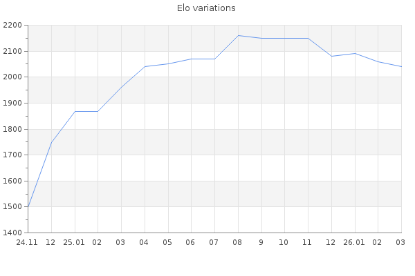 Elo no rounded:2038.4 Rd ( Small rd indicates a reliable elo ) : 112 Elo max :2160 Elo max this year :2160 Moves played :587 Country:Austria